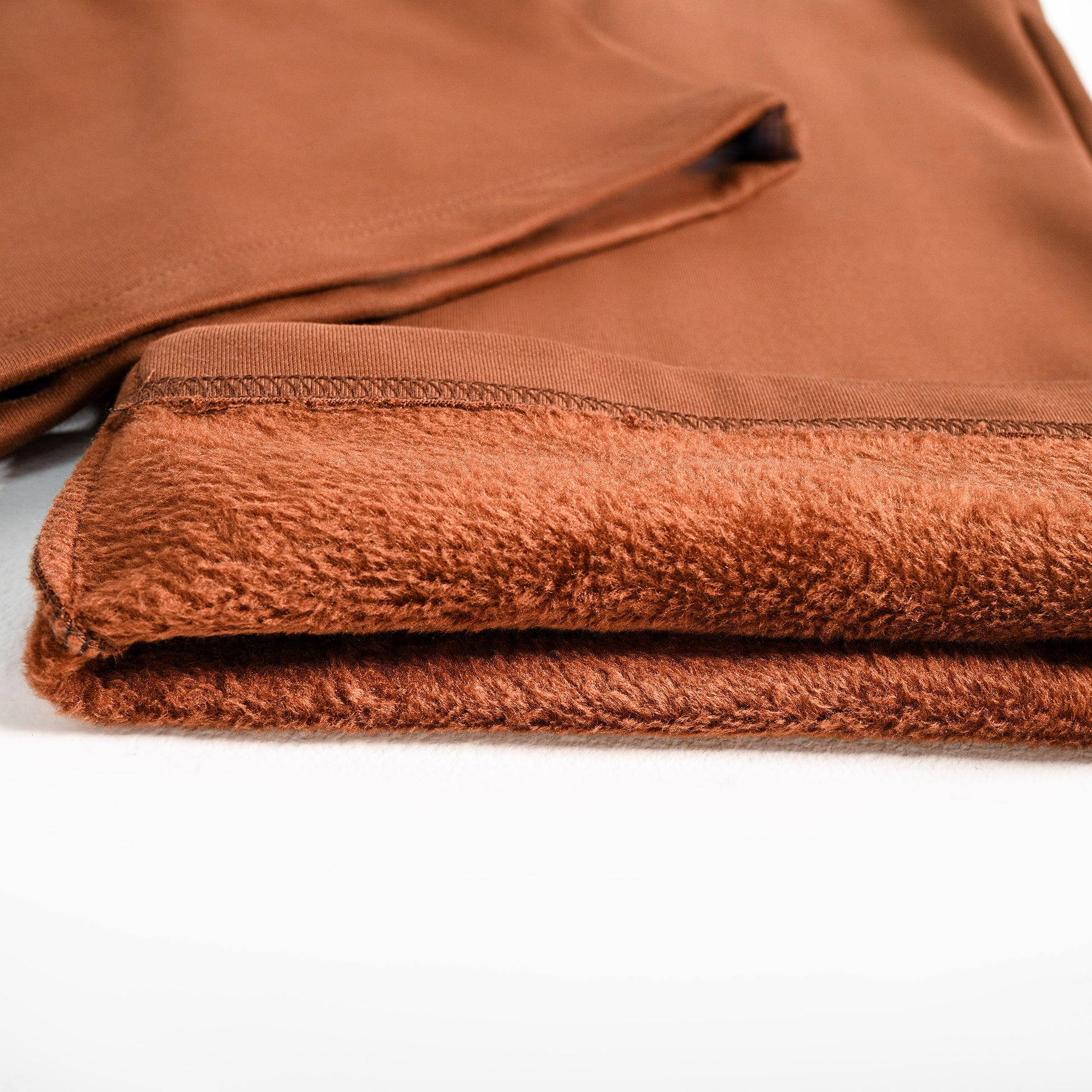 The set includes wide-leg fleece-lined pants, a rounded-hem t-shirt, and a fleece-lined winter jacket with a covered zipper and leather detailing.