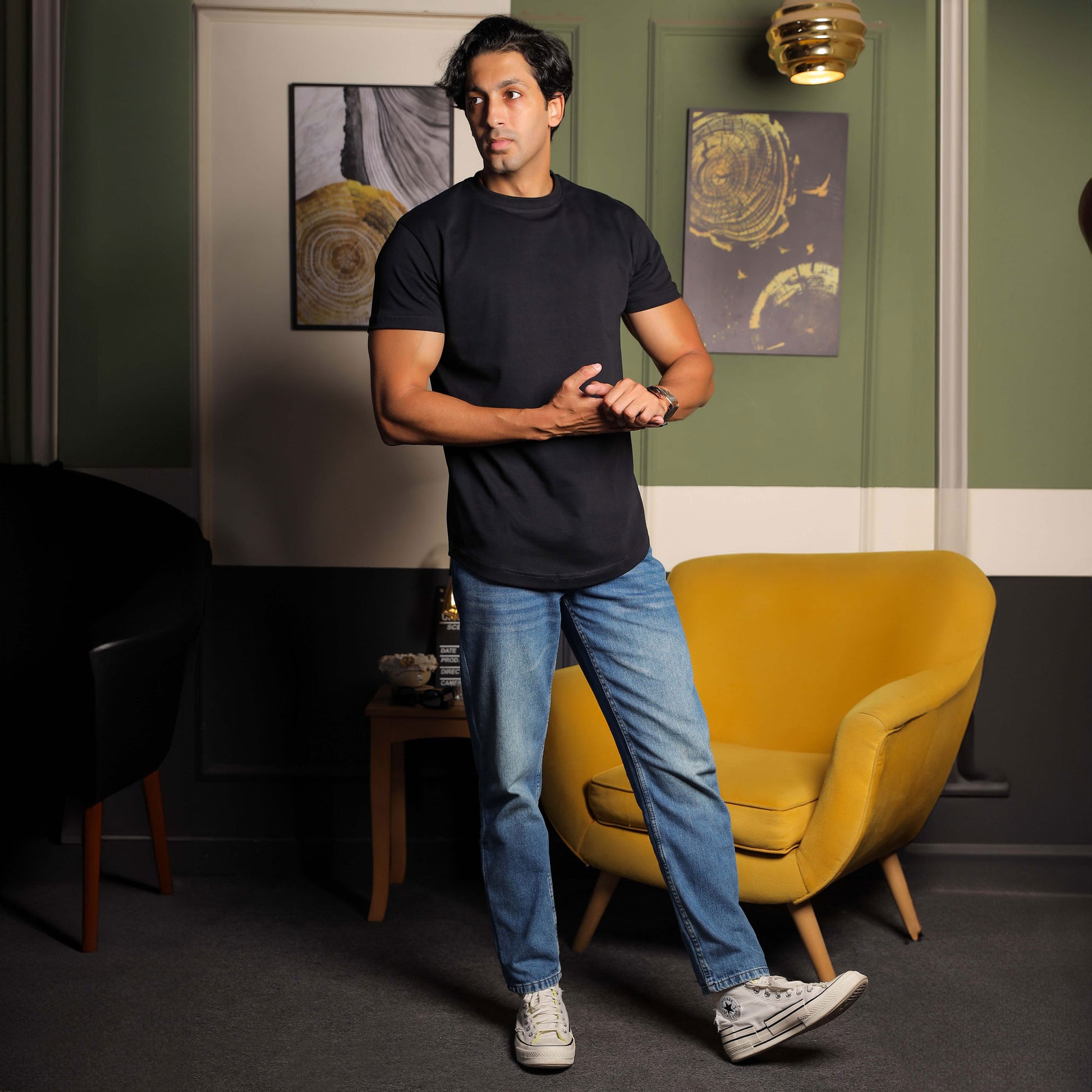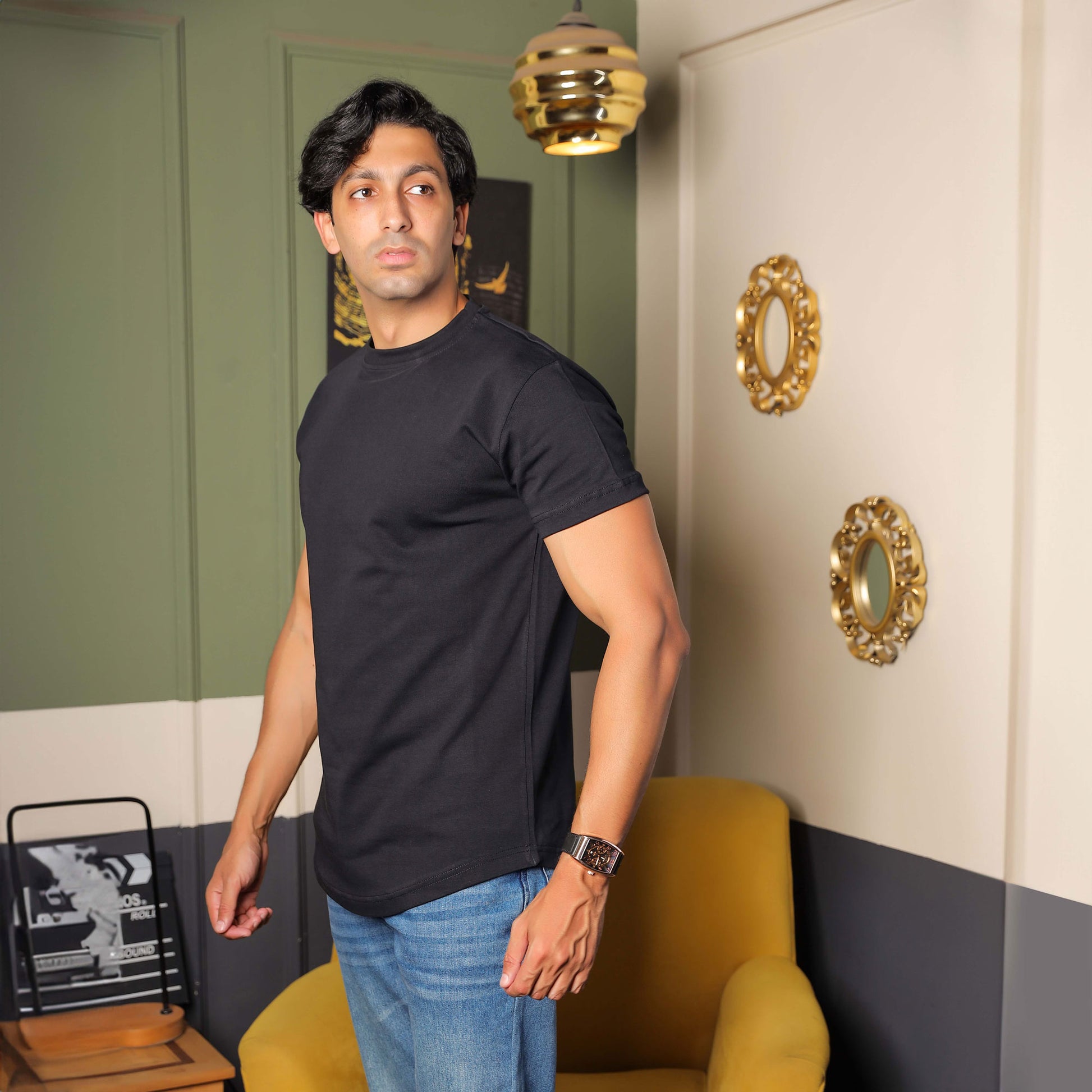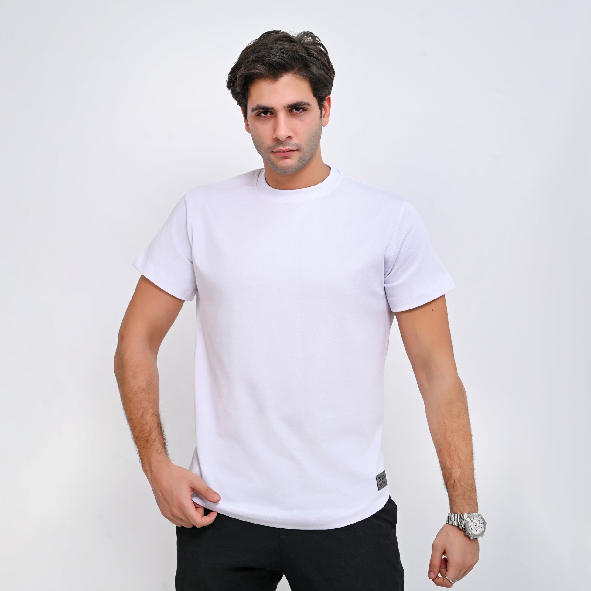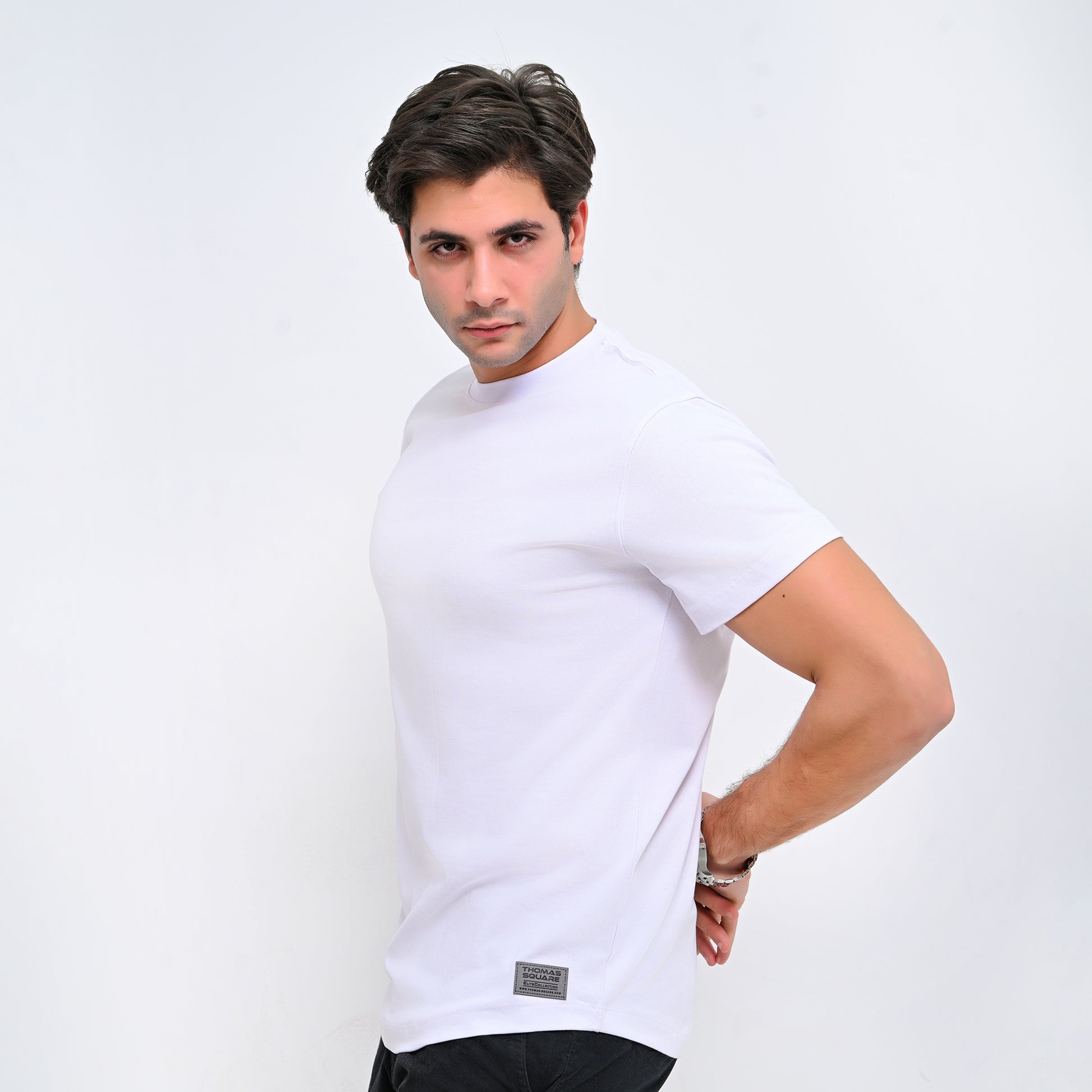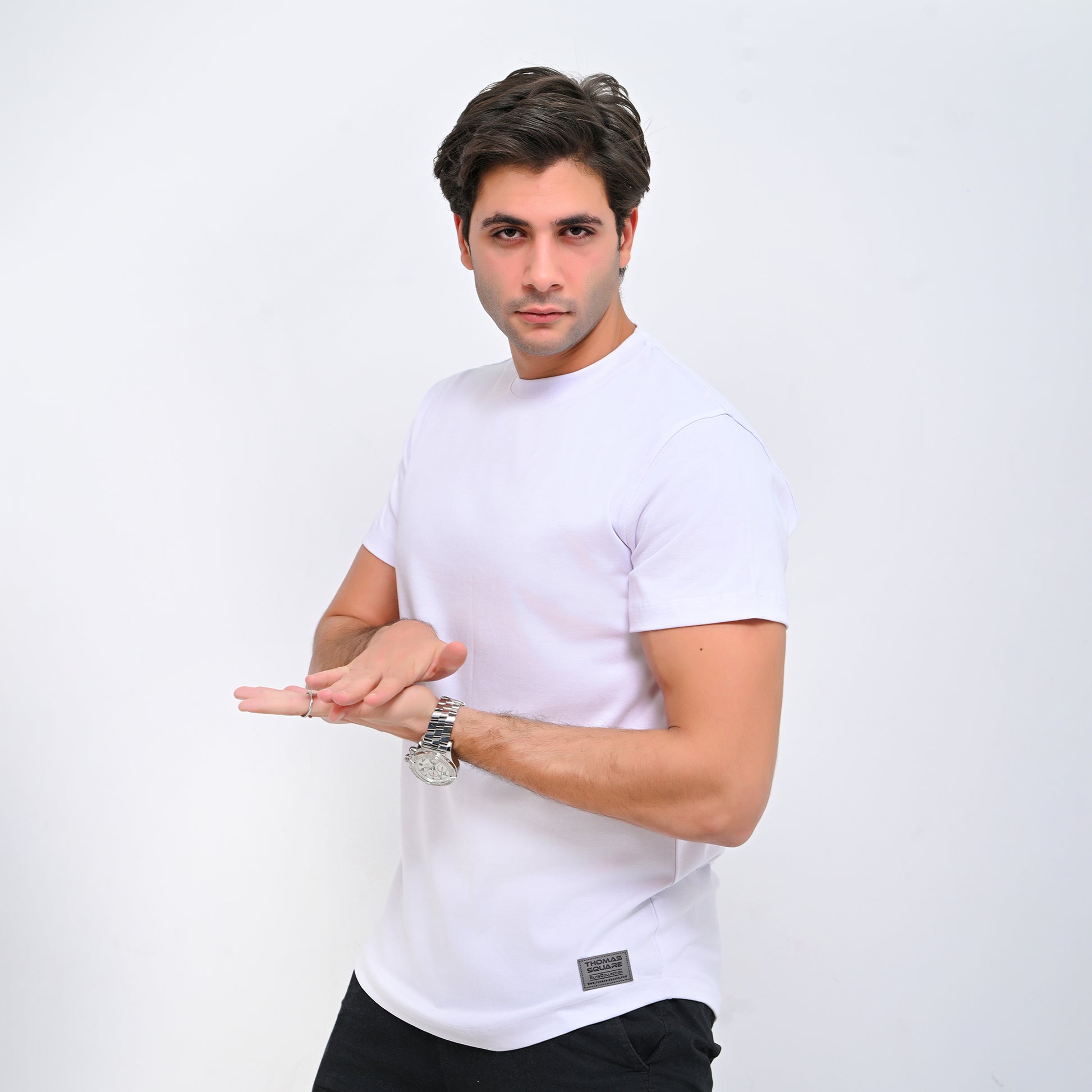 The T-shirt features a rounded bottom cut with a distinctive and youthful character, and the curve is not exaggerated, as it contains elegance while maintaining simplicity.